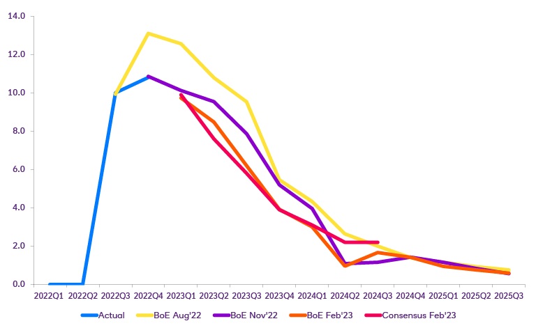 Sources: ONS, Bank of England Monetary Policy Reports, Bloomberg Finance L.P, 6 March 2023