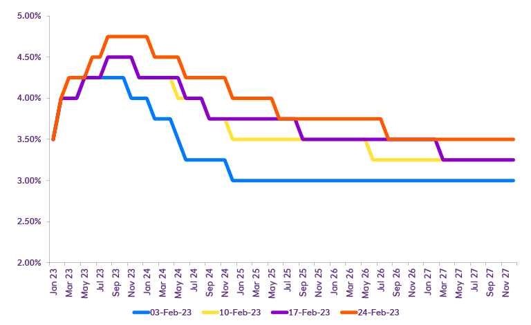 Implied rate expectations inched up to 4.75% in the week to 24 February