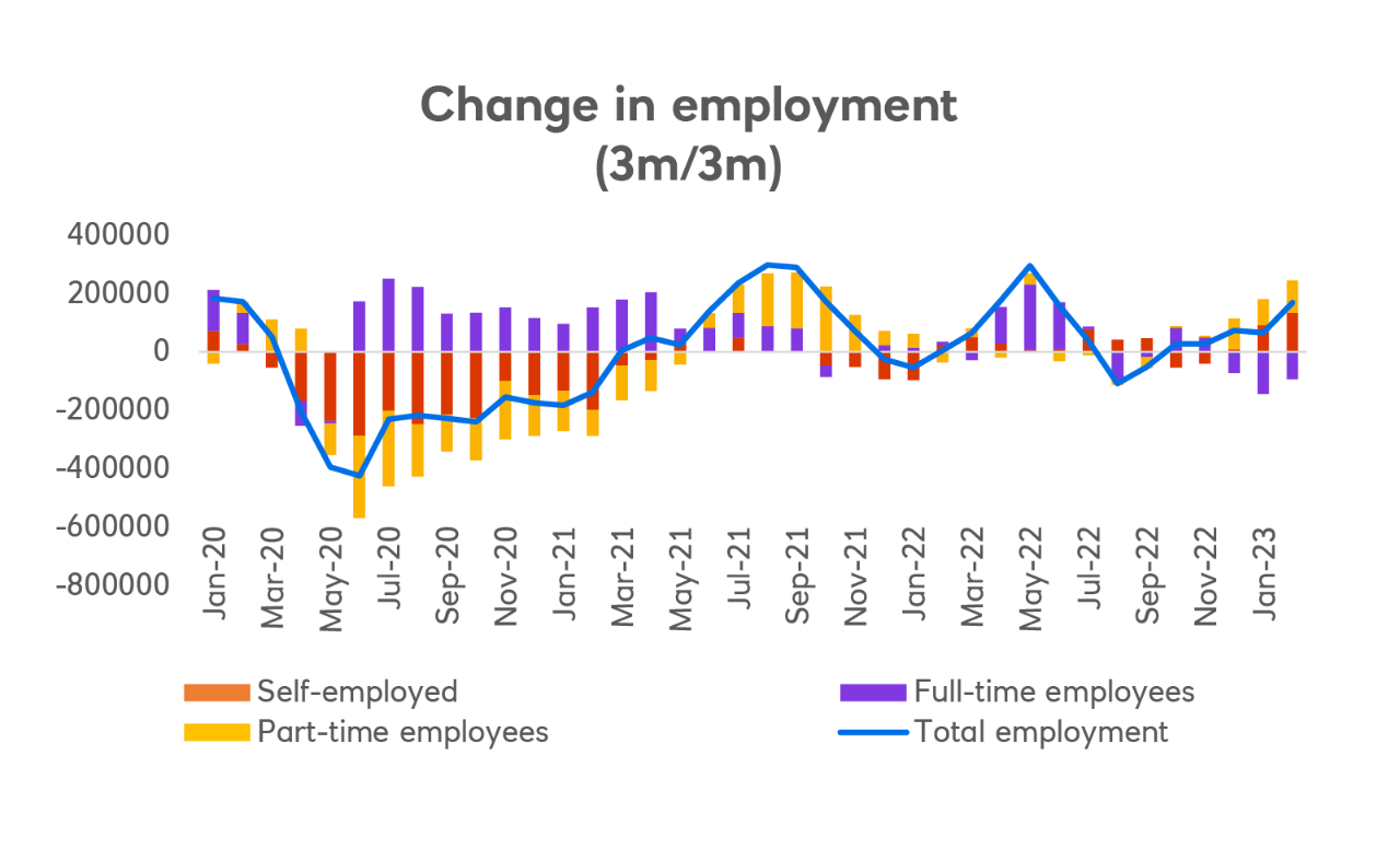 The UK labour market remains resilient. The unemployment rate rose to 3.8% in February after staying at 3.7% for the previous four months. Redundancies remain historically low, while average-three-month employment rose by 169,000 in February, well above the consensus expectation of 50,000.