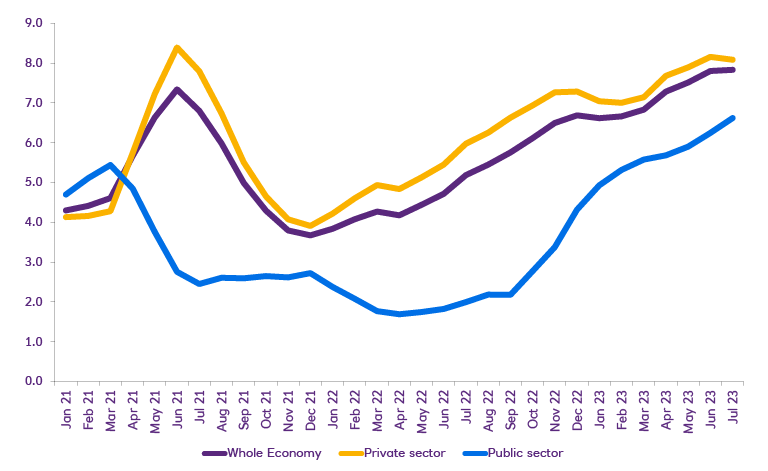 The labour market is clearly cooling, with unemployment above the Monetary Policy Committee’s (MPC’s) 4.1% forecast for Q3. Meanwhile, the three-month vacancy-to-unemployed ratio – seen by the BoE as the best indicator of labour-market tightness – was at 0.71 in July, down from a peak of 1.05 in August 2022.