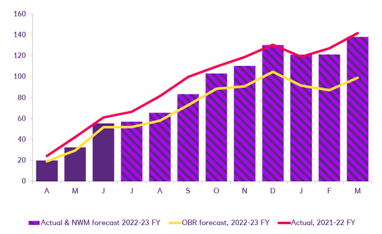 With quantitative tightening (QT) set to kick-in from September and inflation and interest rates continuing to rise, debt servicing costs look likelier than not to swell. Government interest payments jumped to £19.4 billion in June 2022 – more than double the level a year earlier (£9.1 billion) – and reached £33.7 billion in the first quarter of this fiscal year (an increase of 82%). What’s more: we estimate that a 1% rise in RPI inflation increases government debt servicing costs by roughly £4 billion during this fiscal year and the next; a 1% rise in gilt yields could add around £3.7 billion over those two years; and a 1% rise in the bank rate could add as much as £11 billion.