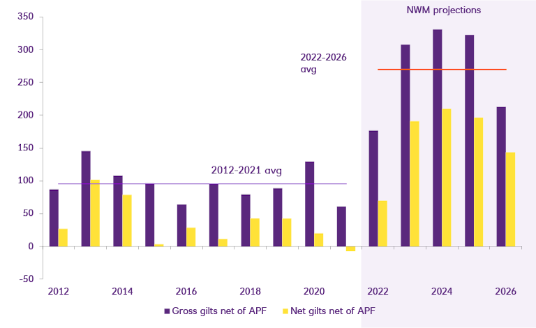 Meanwhile, the Bank of England will be selling relatively large quantities of bonds (we estimate roughly £35 billion per year) back to investors.