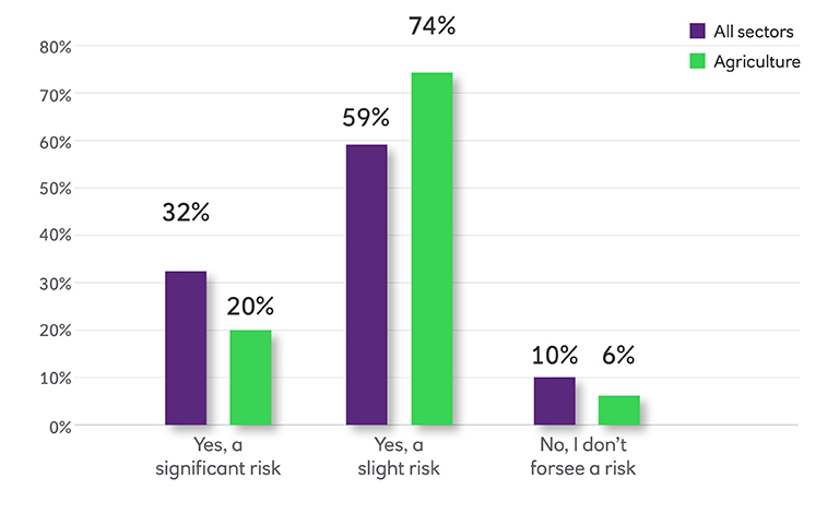While 94% of agricultural businesses fear they could lose customers if they do not display their sustainability credentials, only 20% see this as a ‘significant’ risk, compared with 32% of respondents from all sectors (see chart below). And only 40% believe this risk will materialise in the next two years, compared with 48% across sectors.