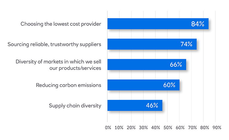 Matthew believes the supply chain crisis is an opportunity to rethink relationships throughout the industry. In our research, 84% of mobility and logistics businesses say low cost is their key demand of suppliers. By contrast, only 46% are concerned about supply chain diversity and only 54% agree that supply chain diversity supports resilience (see chart below).