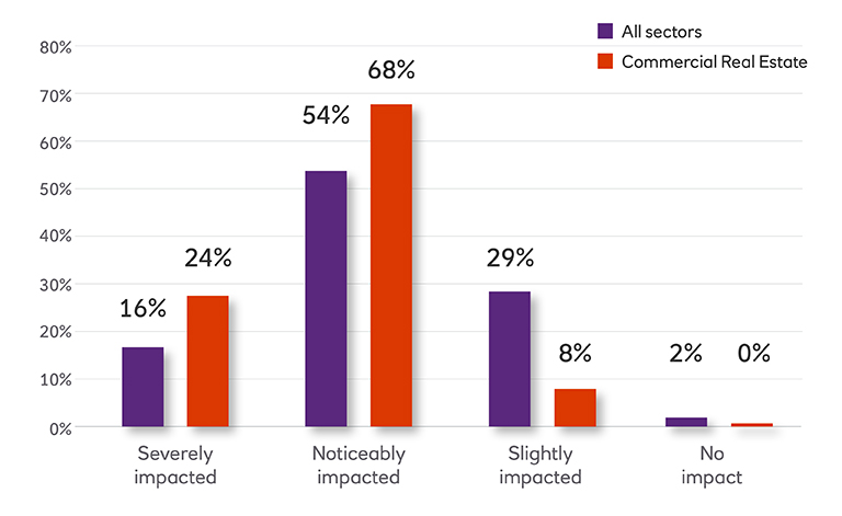 The rising cost of energy is a key issue for CRE businesses – 92% of those surveyed say they have been severely or noticeably impacted by rising energy costs, compared with 70% of respondents across all sectors (see chart below).