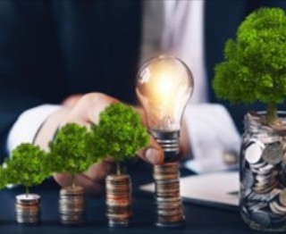 A lightbulb illuminates above a stack of coins adding up to a plant growing from a jar of coins.