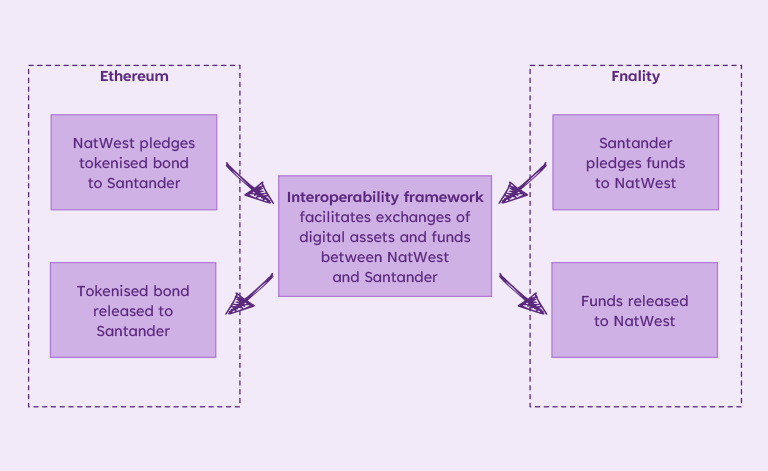 NatWest and Santander piloted a cross-ledger transaction with NatWest acting as dealer and issuer, and Santander fulfilling the role of investor. The pilot was completed between the Ethereum test network (public) and Fnality’s own ledger (private).