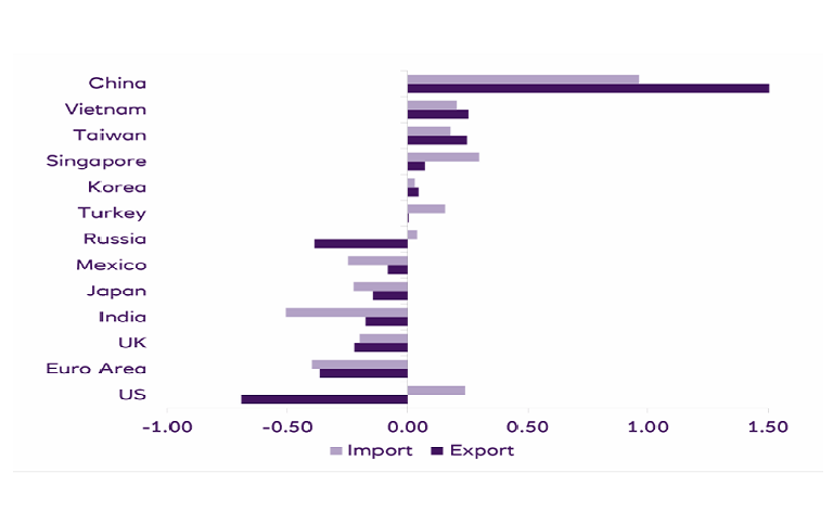 In the UK, which left the EU single market and began trading under a new UK-EU Trade and Cooperation Agreement (TCA) at the start of the year, near-term frictions in goods trade are increasingly apparent with rules of origin requirements piling on costs & administrative burdens for corporates and disrupting supply chains. The UK’s overall trade declined by 21% month-on-month in January, as both exports and imports declined by almost a fifth, but there was a sharp decline in UK-EU trade (-33.2% month-on-month). Indeed, UK exports to the EU declined by 40.5% in January, in contrast to exports to non-EU countries, which increased by 3.6%.
