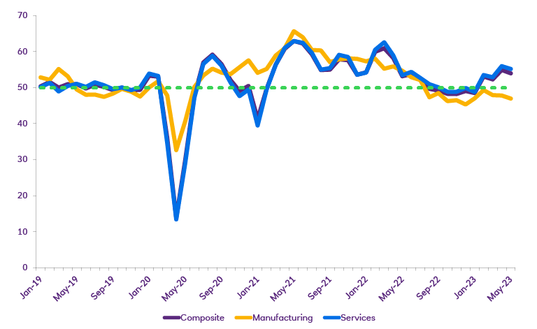 Business surveys improved significantly in April-May relative to Q1, although the UK’s composite PMI eased from 54.9 in April to 53.9 in May. Manufacturing remained a drag, declining for a third consecutive month. This is a story playing out across much of the globe, and especially in Western Europe.