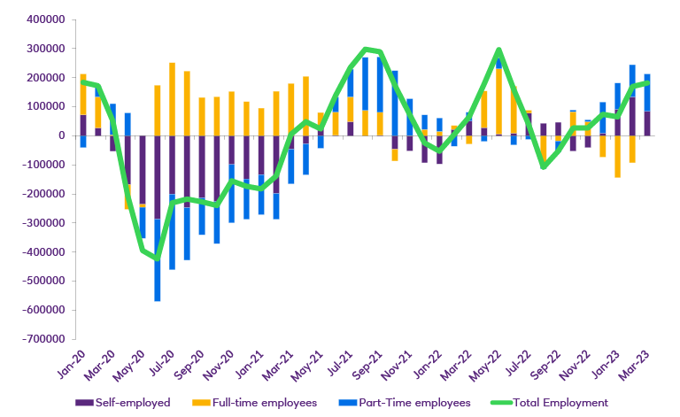 The UK workforce expanded by nearly 460,000 in Q1, boosted by immigration and a 156,000 decline in inactivity among those of working age. This in turn was driven by students looking for part-time work and a full reversal of the rise in early retirement seen during the pandemic – both probably due to cost-of-living pressures. Inactivity is likely to carry on falling. Improved supply has helped ease recruitment difficulties.