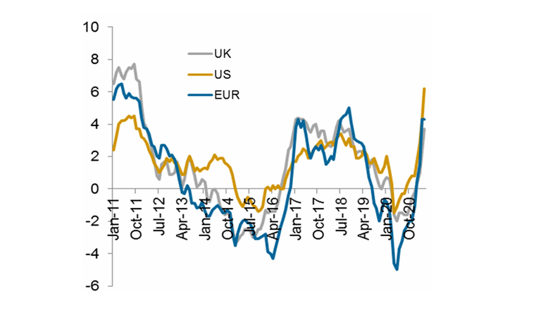Supply chain disruption is becoming more commonplace in the wake of Brexit and the pandemic. Businesses in construction, manufacturing and wholesale have repeatedly mentioned supply shortages, with a variety of materials and semi manufactured goods seeing demand outpace supply. This is evident in the pace of producer output price inflation, although this has, so far, accelerated more quickly in the US and the Euro Area than the UK.