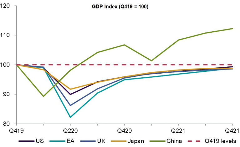 On the business side, increased uncertainty over the outlook, post-crisis overcapacity (particularly in hard-hit sectors, e.g. airlines, hotels, energy), and high debt levels will restrain the rebound in capital spending. While output will surely bounce as the lockdowns are lifted, the case for a strong and sustained consumer- or business-led recovery is limited. In the UK, US, Euro area, and Japan, we expect large increases in real GDP in Q3 and Q4 (recouping a good portion of the output lost in H1) to give way to progressively smaller gains through 2021 — resulting in an “italicised V” or “swoosh-shaped” recovery (in China, the return to pre-virus levels is seen earlier).