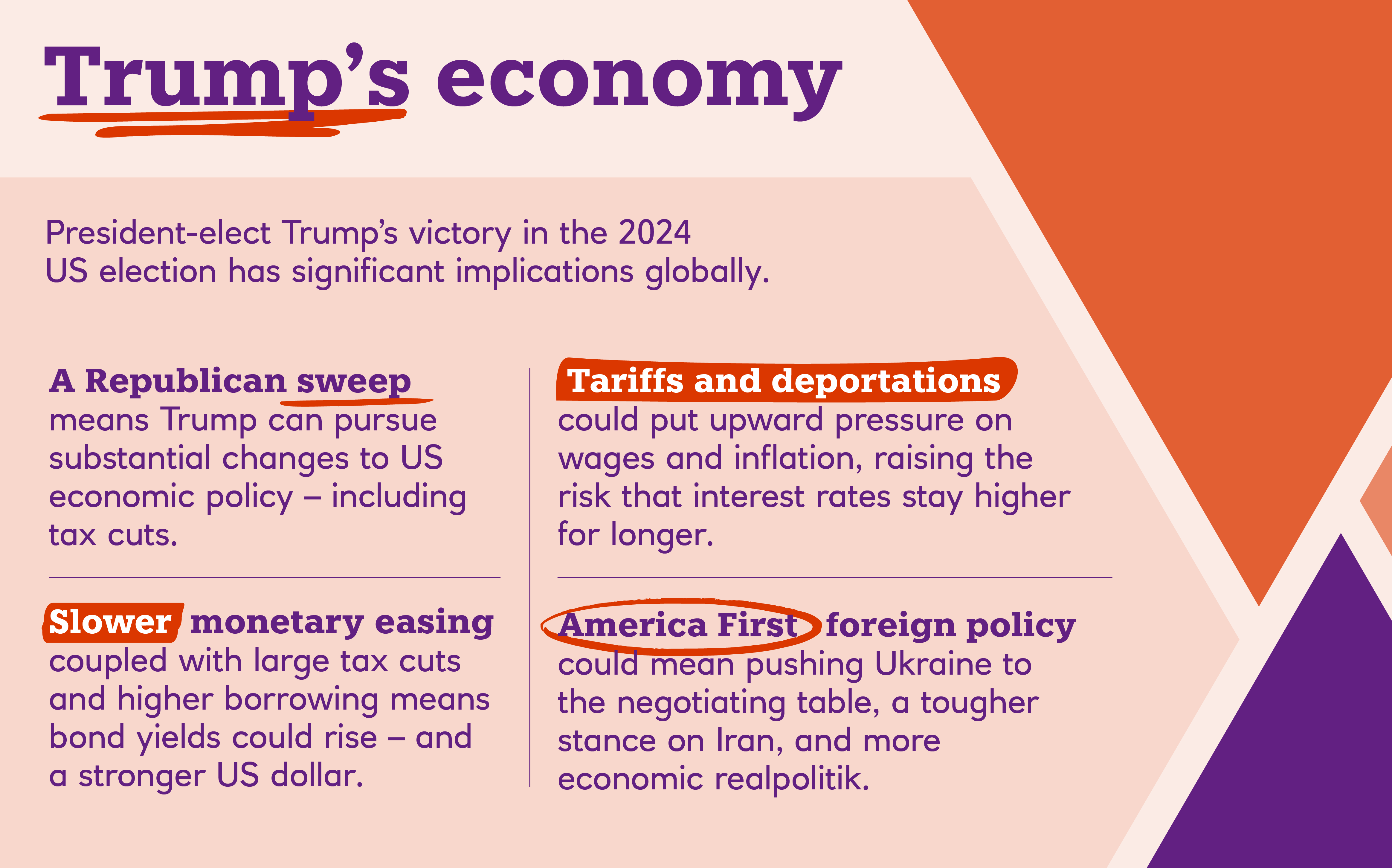 Suffice it to say, there is a lot of uncertainty about both timing and implementation of tariffs. What looks clearer is that Trump’s victory only adds to the broader theme of trade becoming more protectionist and unilateral over time, which is a theme we discuss in more depth. It also lends weight to worries that inflation will remain higher for longer, provoking a slower Fed easing cycle.