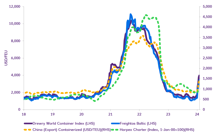 Source: NatWest, Drewry, Shanghai Shipping Exchange, Freightos Baltic, Harper, Bloomberg; weekly data; Latest data as of end-January 2024