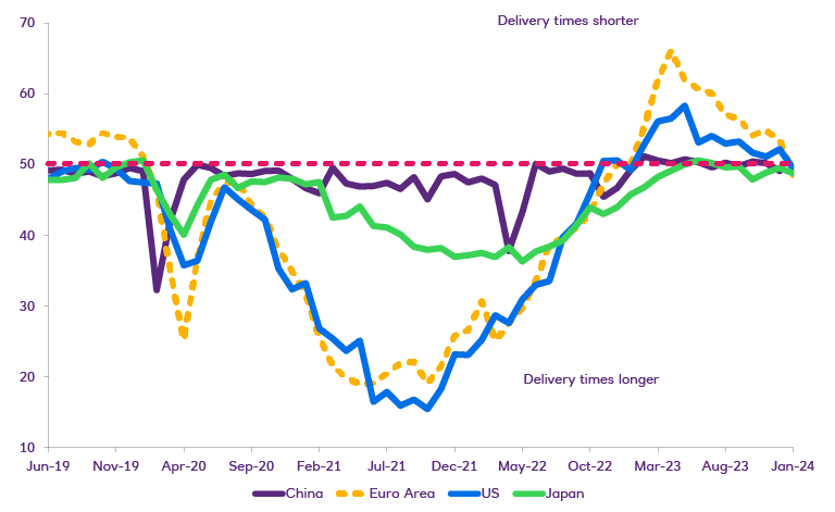 While there’s been a broad-based uptick in costs, these diversions have resulted in a more pronounced rise in shipping costs along the routes that traditionally use the Suez Canal, such as routes connecting East Asia and China to Europe and the Mediterranean. Delivery times increased on average in January, albeit by much less than during and after the pandemic.