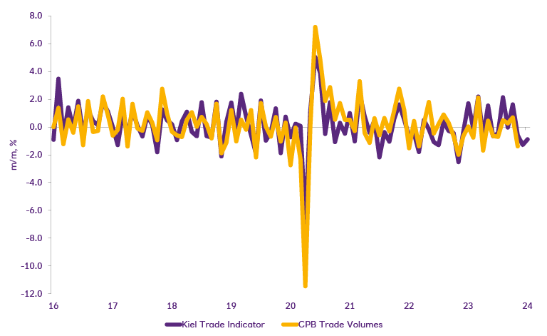 Leading indicators based on real-time data suggest that there’s likely to be a further moderation in global trade over the coming months. According to the Kiel Trade Tracker, which is based on real-time shipping data, it’s expected to contract further due to the collapse in cargo volumes in the Red Sea (see below). The EU is expected to have been the worst-hit region in December – with exports down by 2.0% and imports by 3.1% over the month.