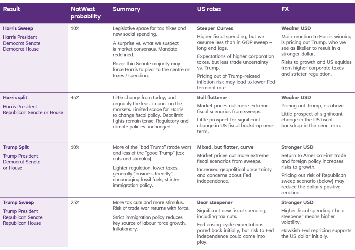 NatWest’s expected market reactions to the various US election scenarios