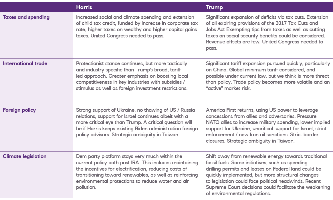 When it comes to foreign policy, we think Harris would essentially continue with Biden’s policies, whereas Trump would probably return to his transactional, America First approach, with increased pressure on the US’s NATO allies and reduced US support for Ukraine. Both candidates would probably maintain a protectionist trade stance, although under Trump there would be increased risk of broad tariff and trade wars, particularly with China. Harris would probably be more selective when implementing tariffs.