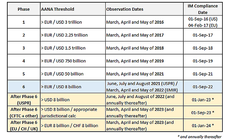 In the table below we list the original phases and compliance dates for the main jurisdictions, then the annual cycle that will start post-Phase 6. For a more complete list see ISDA3 calendar on the AANA page of their Margin InfoHub