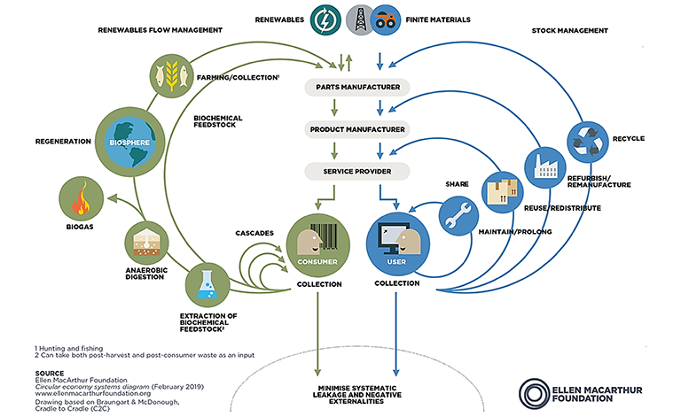 A circular economy is based on three principles: eliminate waste and pollution, circulate products and materials, and regenerate nature. Organisations such as the Ellen MacArthur Foundation, the Waste and Resources Action Programme (WRAP), and the Cradle to Cradle Products Innovation Institute, are driving the switch towards a circular economy, distinguishing between durable and consumable components to ensure disassembly and reuse: