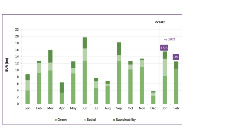 As we move into March, activity in Europe has been extremely limited, however, there has been some FI GSS issuance from the APAC region in USD including a $500m 5Y Green bond from Sumitomo Trust Bank and a $400m 3Y Sustainability Bond from Bank of China (Sydney Branch). The European FI GSS market re-opened on 9 March with a €750m Green Covered Bond from Banco BPM (upsized from €500m) which was initially announced on 23 February.