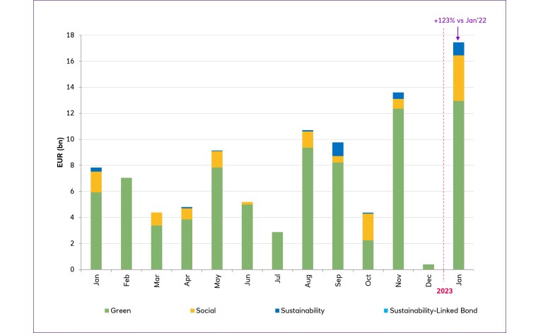 GSS/S issuance more than doubled in January, on a year-on-year (YoY) basis (+123%), recording the busiest ever January in the European Banks & Insurance GSS/S market.