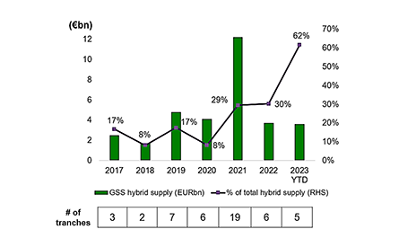 The high-beta nature of the hybrid asset class, and higher all-in yields, can deliver a more pronounced greenium and improved market access for new issues, which provides an opportunity for corporates to capitalise on ESG-labelled instruments. Although all hybrid transactions in 2023 so far were oversubscribed, green hybrid issues had a higher average oversubscription of 7.3x (at final terms) vs. 6.4x for non-green hybrids.