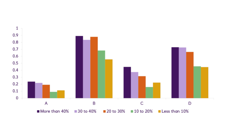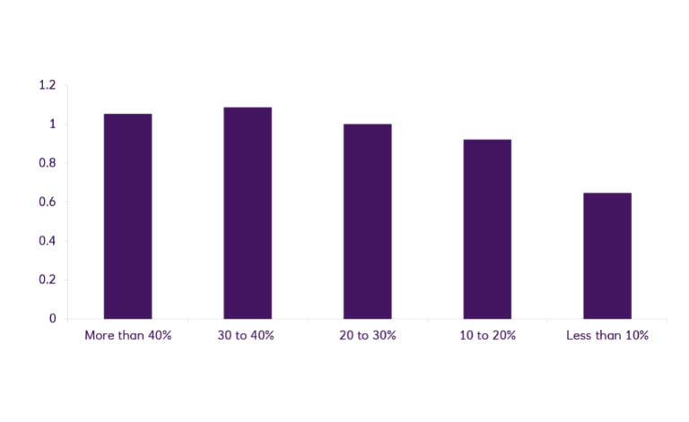 We find that the average proportion of women on boards in recent years has been just 23%, globally, and that this proportion is only rising slowly – from 21% in 2014 to 24% in 2019. There’s a lot of variation, however, with the proportion at individual firms ranging from 0% to around 65%. Overall, European companies tend to have the highest proportion of female board members, while firms in emerging markets have much lower female representation on their boards on average.