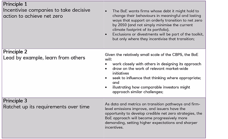 Consequently, issuers with a stronger climate performance will become the preferred targets for the CBPS, and as such will find it easier and cheaper to raise money, while businesses that the BoE regards as ‘inconsistent with achieving net zero’ and hence as not suitable for its portfolio, will most like pay a ‘penalty’ on the financial markets when raising debt and will see their reputation tarnished.