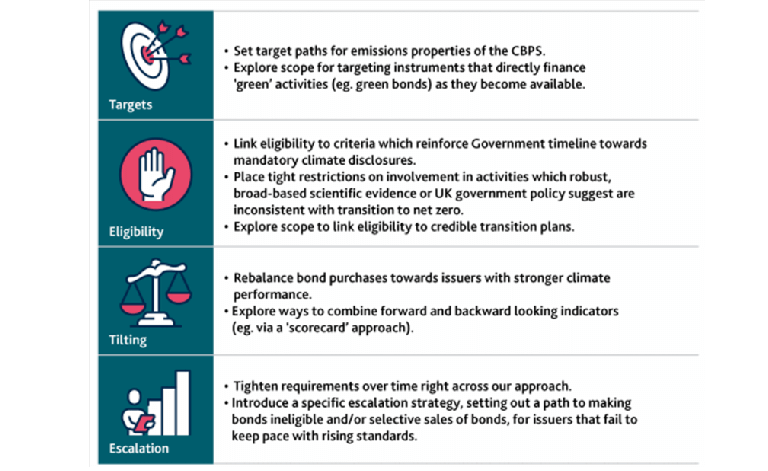 While campaigners have long criticized the BoE’s bond buying from ‘big polluters’, and the public debate about the appropriate carbon price to achieve the Paris Agreement goals is ongoing, the BoE is demanding that UK corporates do their green homework. It will set targets for the overall emissions of its corporate bond holdings, invest in ‘green’ corporate bonds as they become available, and it will request bond issuers to publish their emissions as well as price in climate risks and transition costs.