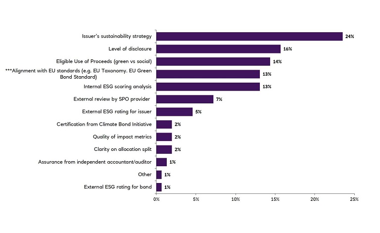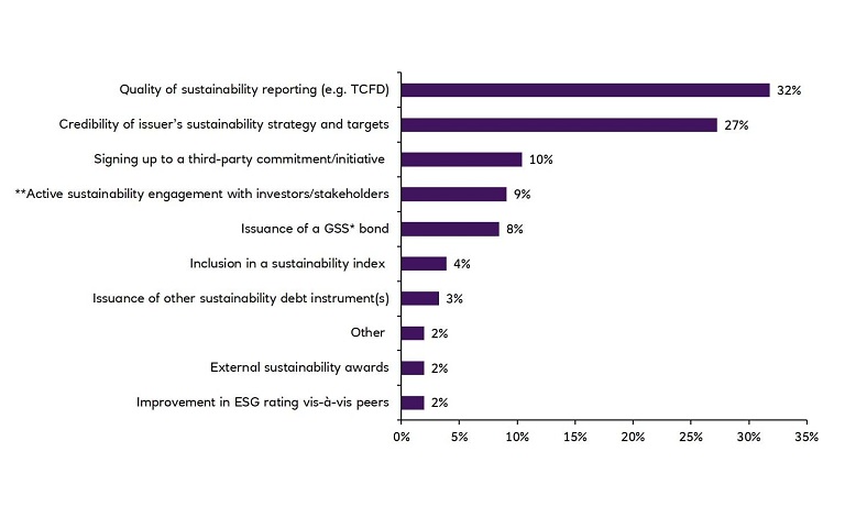 The action considered by investors to best underscore an issuer’s commitment to sustainability is the quality of sustainability reporting, which goes back to investors’ concern about a lack of credible ESG data. Clearly, it’s crucial for issuers to have their “house in order”, in terms of reporting and strategy.