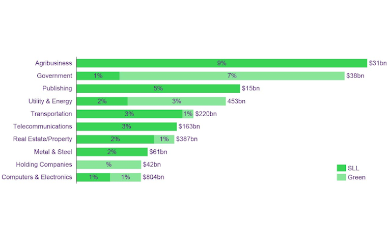 With agribusiness comprising the highest composition of sustainable finance vs conventional this quarter (Figure 3), real asset sectors make up of over half of the top 10 sectors to have linked their lending to sustainability incentives. Prominent deals have included a $8bn green loan for Orsted A/S (Utility & Energy) and a $2.6bn syndicated SLL facility for Invivo Group.