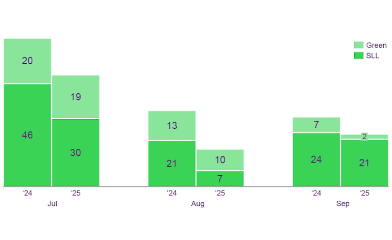 Q3 2025 sustainable lending volumes (Figure 1) have seen a noticeable reduction in SLL and green lending activity, shown by a 33% reduction in July and a halving in volumes in August. The interesting observation in this trend is the fact that green lending had exceeded SLL volumes in August 2025. One of the possible reasons for the increasing uptake of green use of proceeds transactions relative to SLL is the omission of mandatory reporting and verification requirements that some borrowers may feel are costly / burdensome.