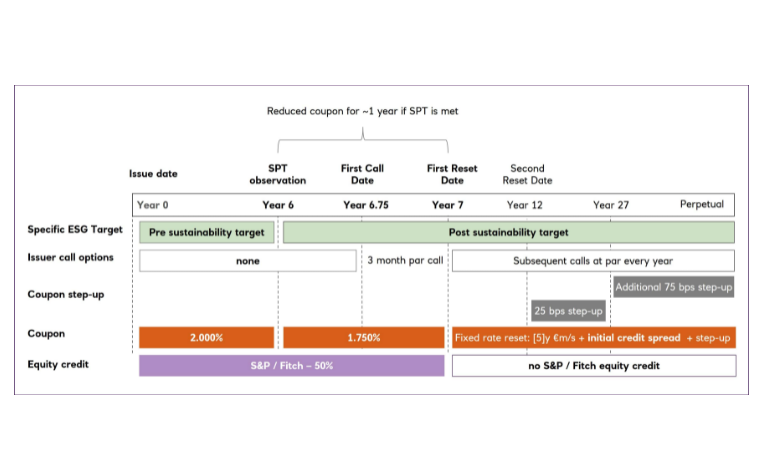 In a potential SLB hybrid, a key consideration would be the date at which the SPT would be observed. In order for the structure to have an economic impact, the SPT would need to be observed before the first call date of the hybrid. Otherwise, an Issuer could call the bond before measurement of the KPI, making the SPT test effectively redundant.