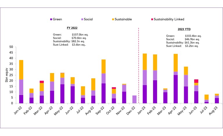 GSS/S issuance fell considerably in July and August (-57% compared to 2022), as the slower summer period set in. Green GSS/S issuance (c. $103.4bn) represents 48% of GSS/S issuance in 2023 year-to-date (YTD), with a slight lead relative to social and sustainable issuance (22% and 29% respectively). GSS/S issuance in the SSA space is led by Agencies / Local Authorities (44%) followed by Supranationals (29%) and Sovereigns (28%).