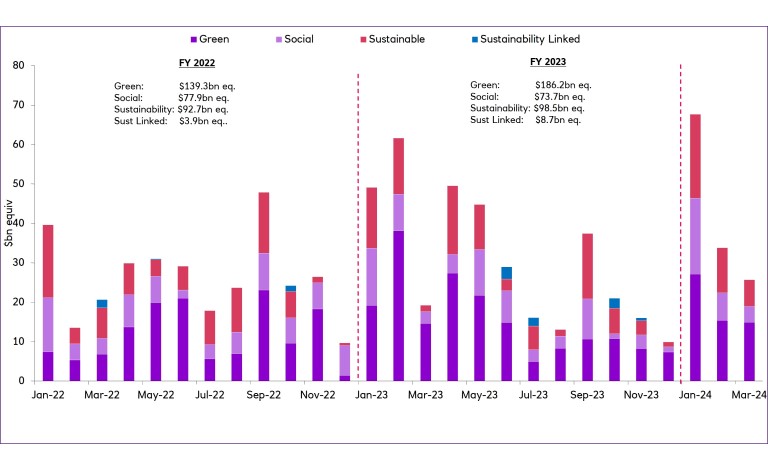GSS/S issuance in Q1 2024 has seen nearly identical volumes to those in Q1 2023. Green GSS/S issuance (c. $57bn) represents 45% of GSS/S issuance in 2024 year-to-date (YTD), with a slight lead relative to social and sustainable issuance (24% and 31% respectively). GSS/S issuance in the SSA space is led by Supranationals (37%) followed by Sovereigns (33%) and Agencies/Local Authorities (30%).