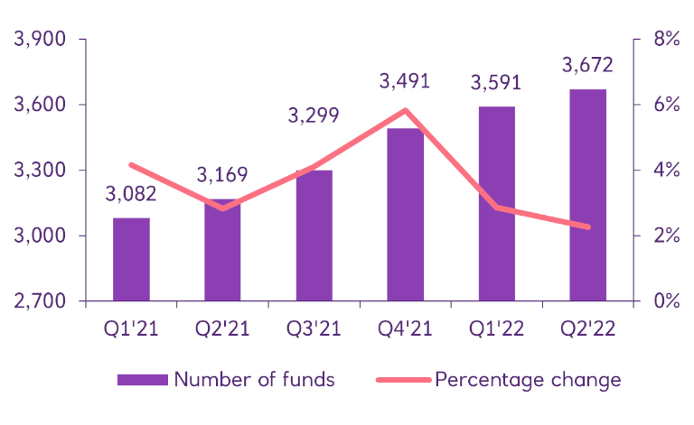 • The number of sustainability-focussed funds has continued to grow reaching a new record of 3,672 funds at the end of Q2 2022. However, the pace of growth slowed down (2% in Q2) relative to the previous 12 months when new funds were established at an average rate of ~4% per annum