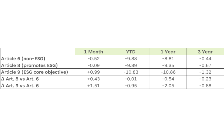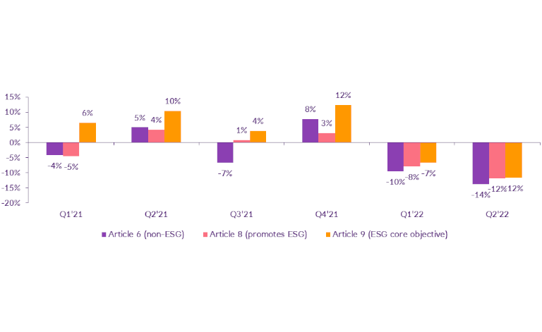 • Consistently, ESG funds have underperformed from the beginning of the year with Article 9 funds (those with ESG as a core objective) the most exposed to the macro and geopolitical headwinds, in part due to the portfolio concentration in certain sectors