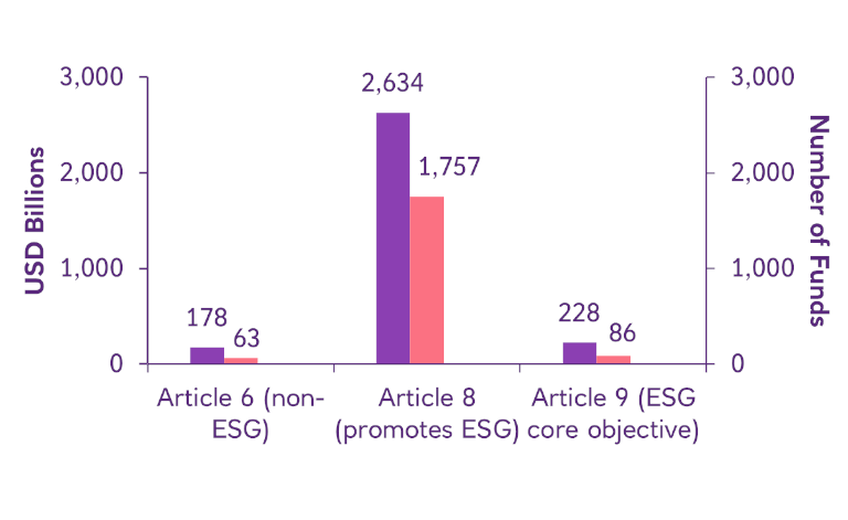 Note: The EU Sustainable Finance Disclosure Regulation (SFDR) is a set of EU rules used to classify funds incorporating sustainability into investment processes. Article 8 indicates that the fund promotes environmental or social characteristics; Article 9 indicates that the fund has sustainable investment as its objective; Article 6 indicates that the fund does not incorporate sustainability as per EU standards. Out of the total 3,040 funds, 2,138 funds (70%) domiciled in Europe were classified as per the SFDR.