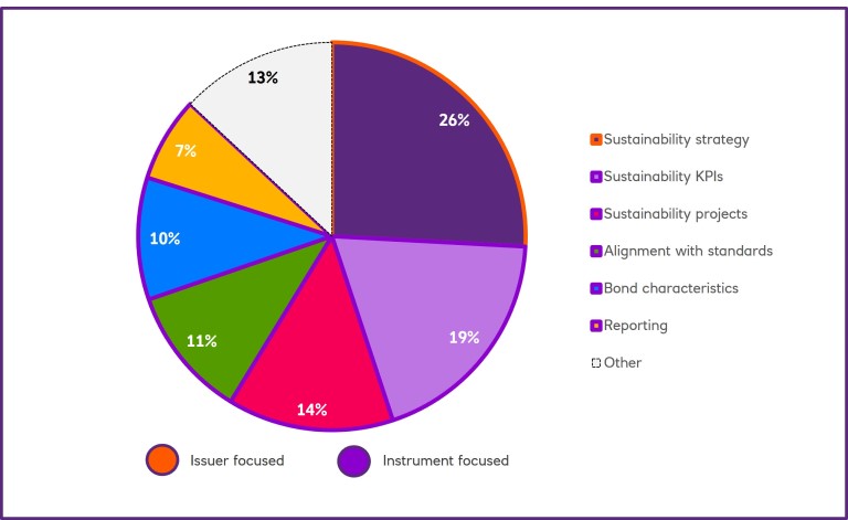• For sustainability-linked and GSS use-of-proceeds bonds, investors go beyond the frameworks and disclosures to ask about sustainability Key Performance Indicators (KPIs) (19%), and sustainability projects (14%) as the 2nd and 3rd most discussed topics.