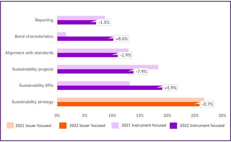• Share of questions about bond characteristics increased by ~9% compared to 2021, with more investors demanding a clear rationale for using a particular label for issuance and having meaningful step ups