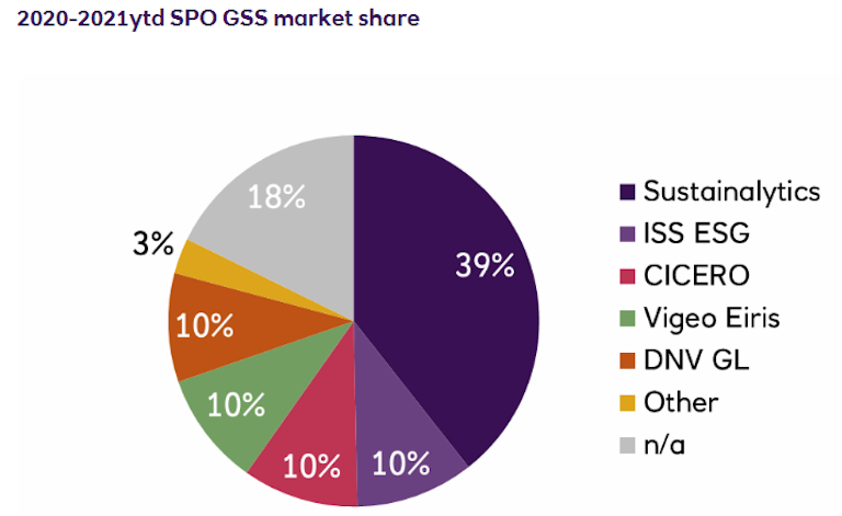 So, what tends to move the needle towards one (out of many) SPO providers? To start to shed more light on this process, we have been running initial statistical analysis on a sample of inaugural Green, Social and Sustainability (GSS) “use of proceeds”-labelled debt instruments, issued between 2014 and 2021. The sample includes 75 corporate transactions opined on by two leading SPO providers with a global footprint.