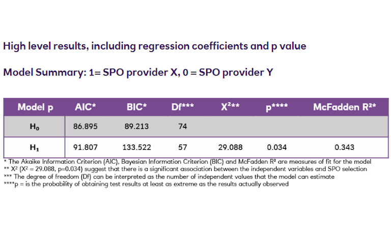 The regression is in the form of a probit model, which is used to predict a binary outcome (SPO provider X or SPO provider Y) given a set of independent variables. The model summary suggests a significant relationship (p=0.034) between the outcome (SPO selection) and predictor variables we have identified. It also has a reasonable model fit for making this prediction (The McFadden’s R2 is 0.343).
