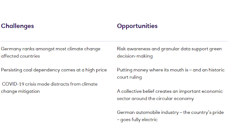 We’ve picked a few examples of how the German authorities are using data[18]: In April last year, the German Environment Agency published a comprehensive research report that drilled down to specific aspects of climate change and their impact on the German economy. The report concluded that for regions outside the EU, the three climate change impact chains included in the model analysis (‘change in labour productivity’, ‘change in agricultural yields’ and ‘rise in sea level’) will result in major welfare and GDP losses, especially in China, India, South and Southeast Asia, the Middle East and Africa. The purchasing power of countries in those regions would decrease considerably over time compared to the reference development without climate change, leading to substantial indirect negative consequences for Germany as a trading partner. The report recommended that German businesses should aim for a targeted regional combination of trade and climate policy measures, which should include: