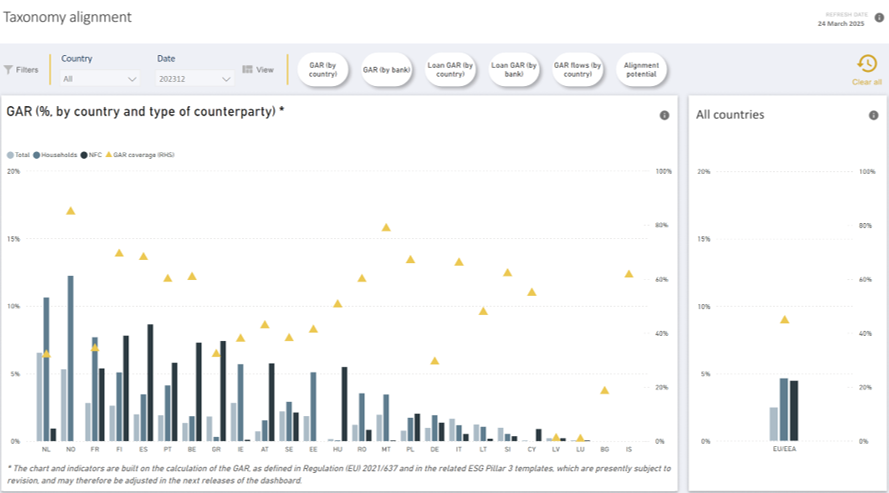 - The dashboard also found that the green asset ratio (GAR) remains low, with an average loan GAR across the EU/EEA of 6% as of mid-2024, although the EBA noted that this is partly “due to the fact that the economy is still under transition, with at this stage few activities being able to demonstrate alignment with the Taxonomy criteria”.
