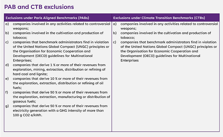 Application of Paris-aligned benchmark (PAB) and climate transition benchmark (CTB) exclusions