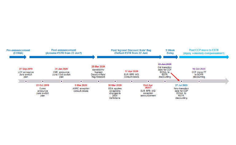 The change to the CCP date from June to July adds some further operational complexity, as swaption trades entered since the end of March (using €STR) and expiring before the new switch date, would have a payout that diverges from the price of the underlying cleared swap (as cleared swaps as of this date would still use EONIA discounting). There is a consultation from ECB on the compensation mechanism where closing date was extended to 17 April (the ARRC (Alternative Reference Rates Committee) consultation closed on 9 March).