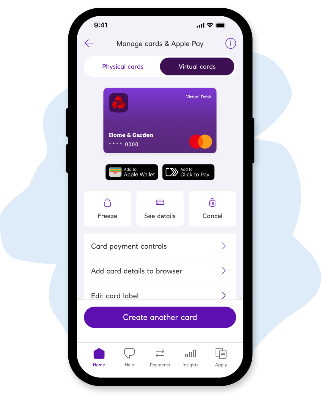 Open your app and go to ‘Manage cards & Apple/Google Wallet’ then ‘Virtual cards.’