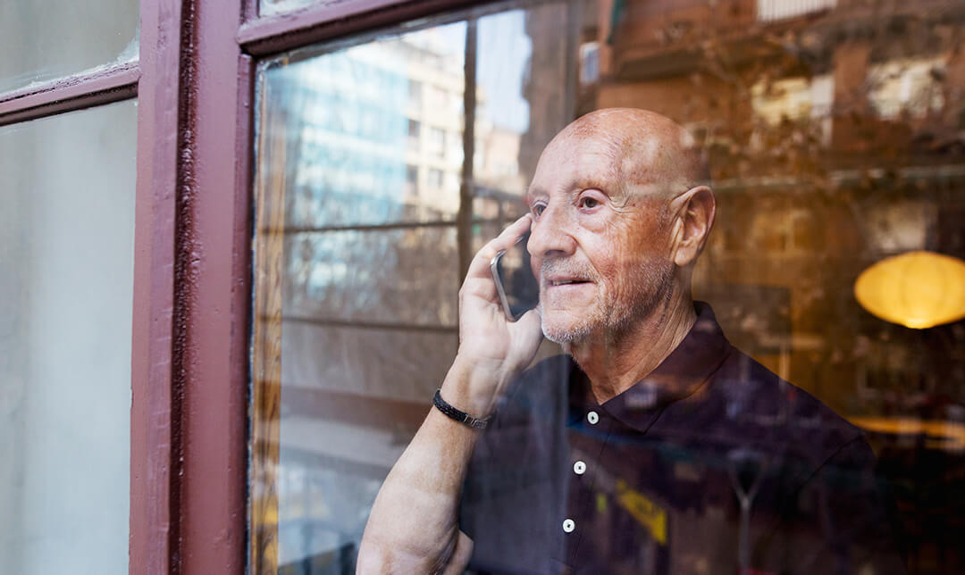 A man staring out of a window whilst on a phone call.