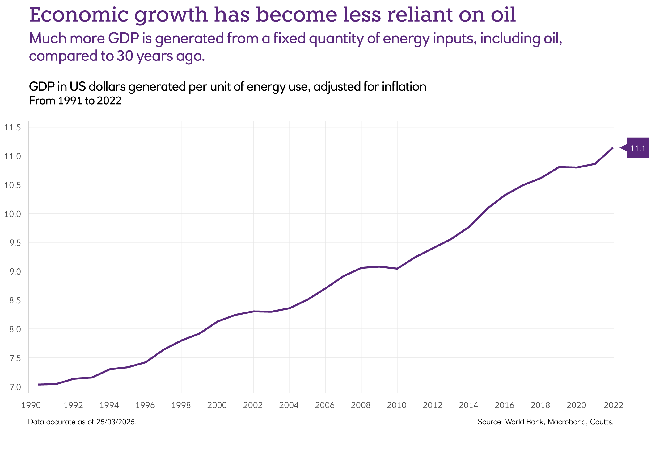 An example of the demise of tangible assets is oil, which was once the lifeblood of economic expansion but has seen its grip loosen dramatically over the past few decades. The chart below shows the steep rise of GDP generated over the years from the same, fixed quantity of energy produced.